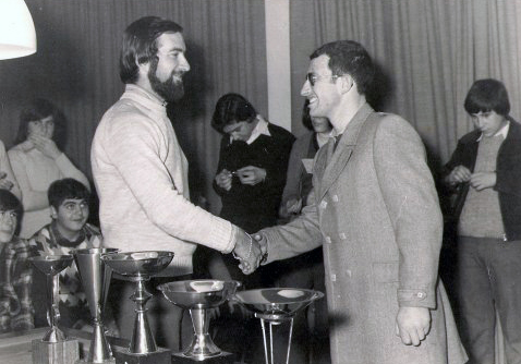 Clusells fa entrega d'una medalla de participació al primer campionat de billar de 1975 a Josep Fradera i Manils